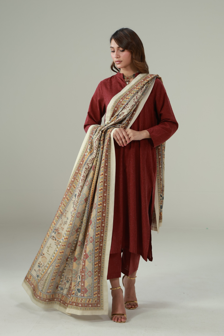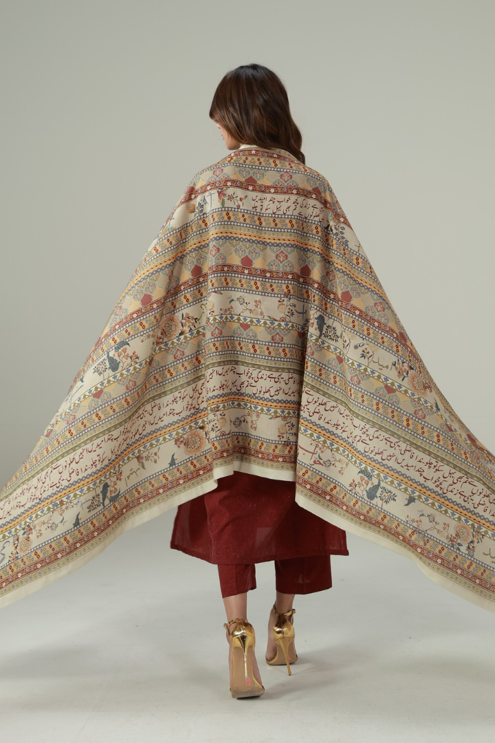 Bayaan Shawl, made from Cotton Silk, is a printed odhni featuring the words of Nida Fazli calligraphed throughout.
