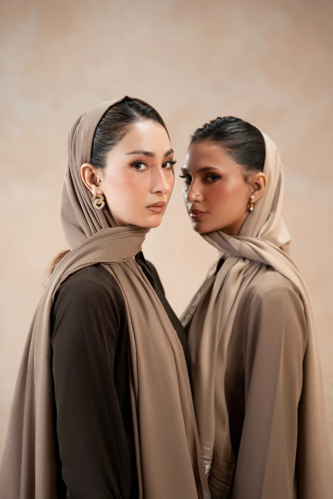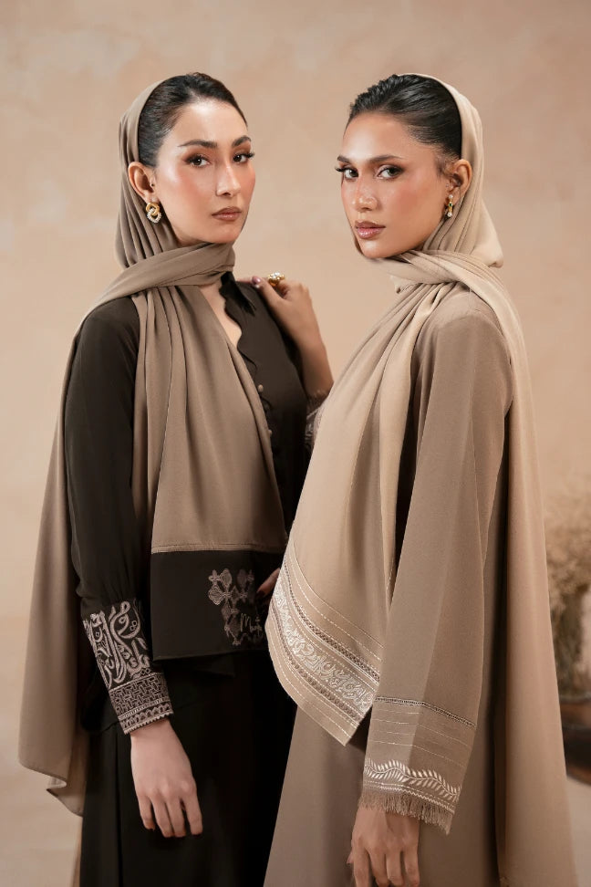 The Halia Scarf, made using Georgette. Features Urdu huroofs embroidered on one side of the scarf.