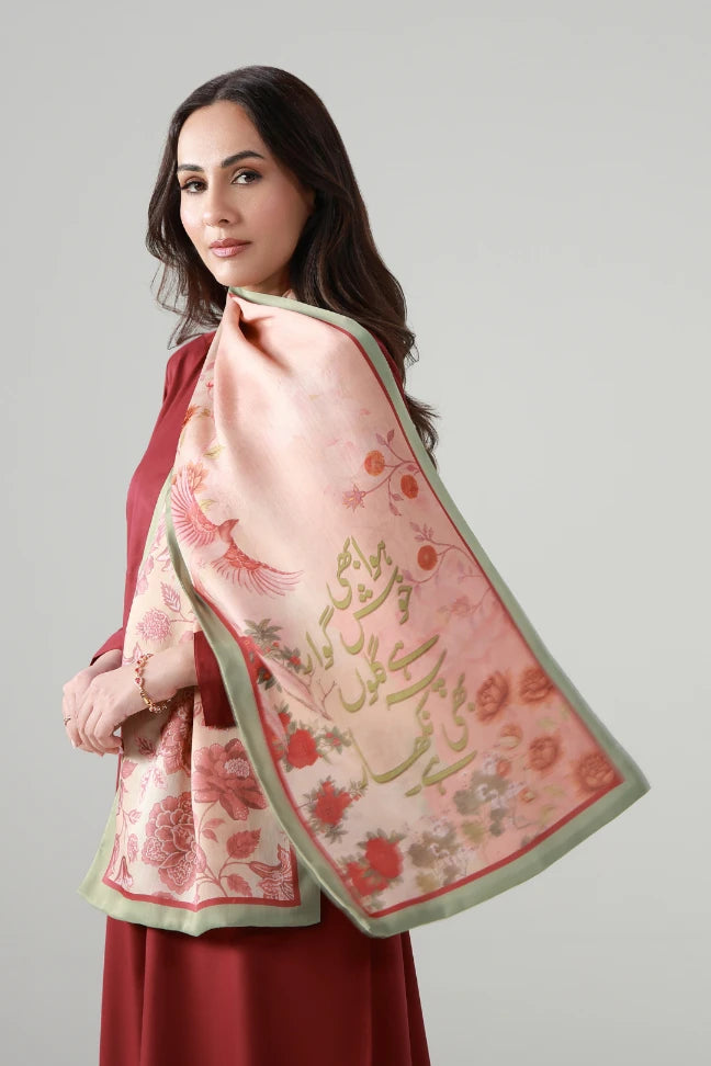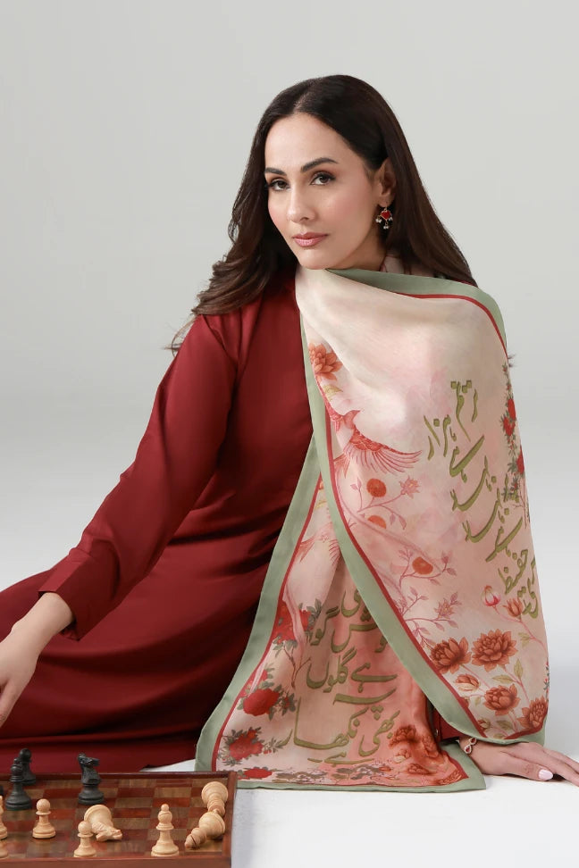 Rabail Stole is made from premium crinkle silk and is calligraphed with the words of Hafeez Jalandhari throughout.