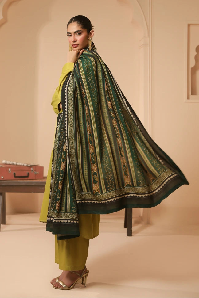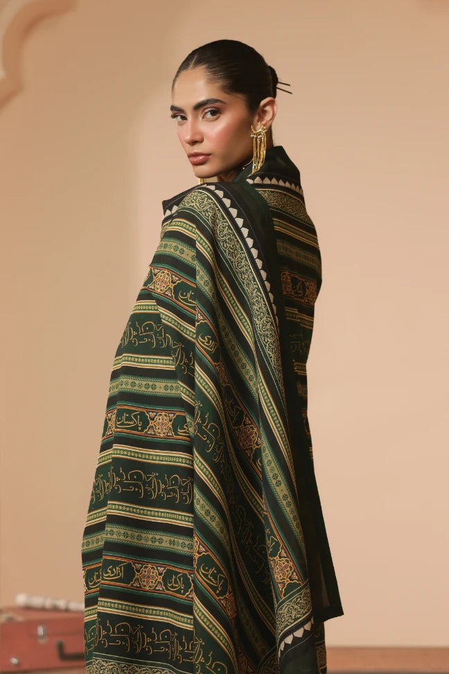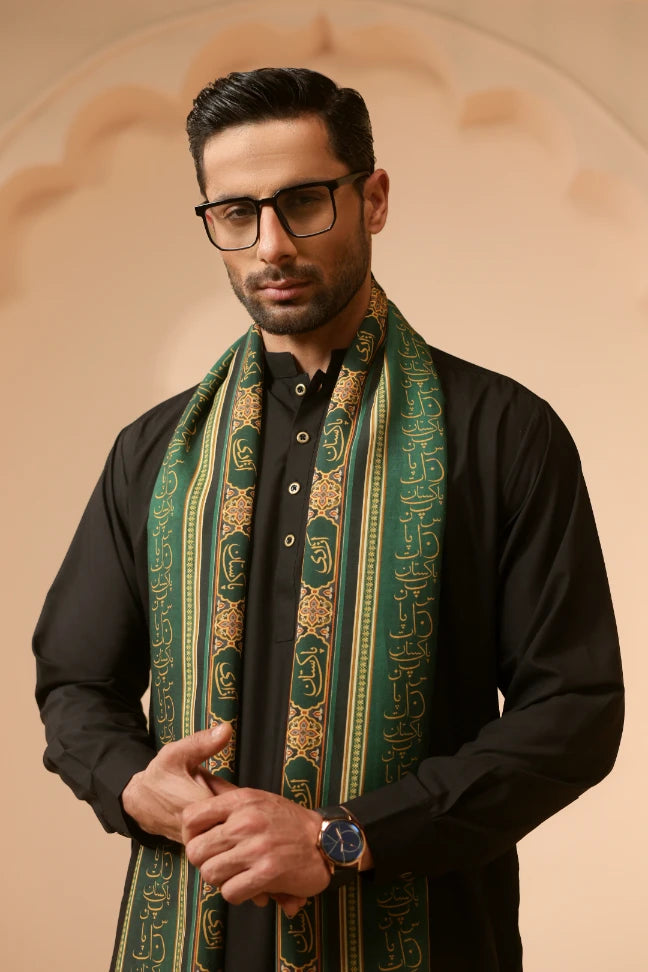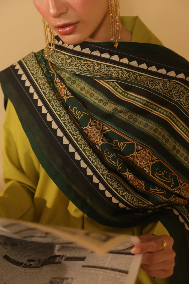 Tehreek Shawl, made from Premium Viscose, is a printed odhni featuring the Urdu words Pakistan and azaadi calligraphed throughout.
