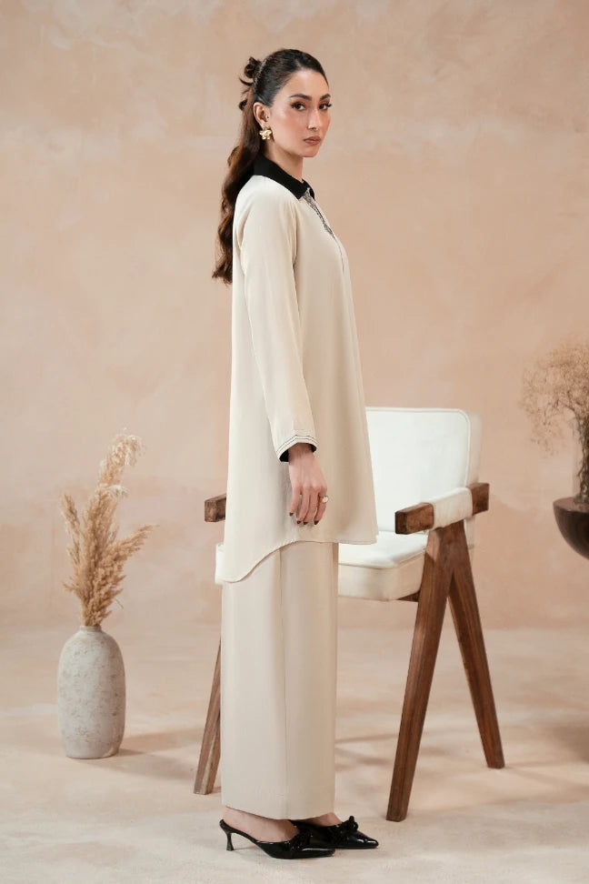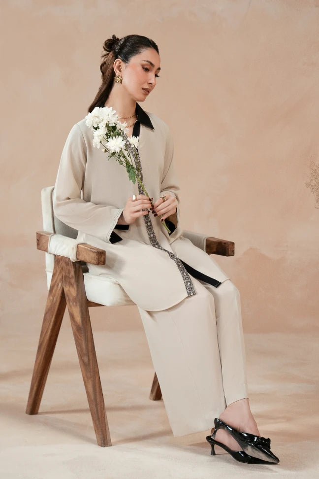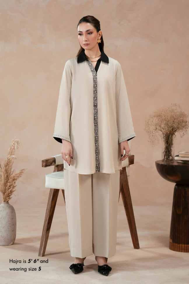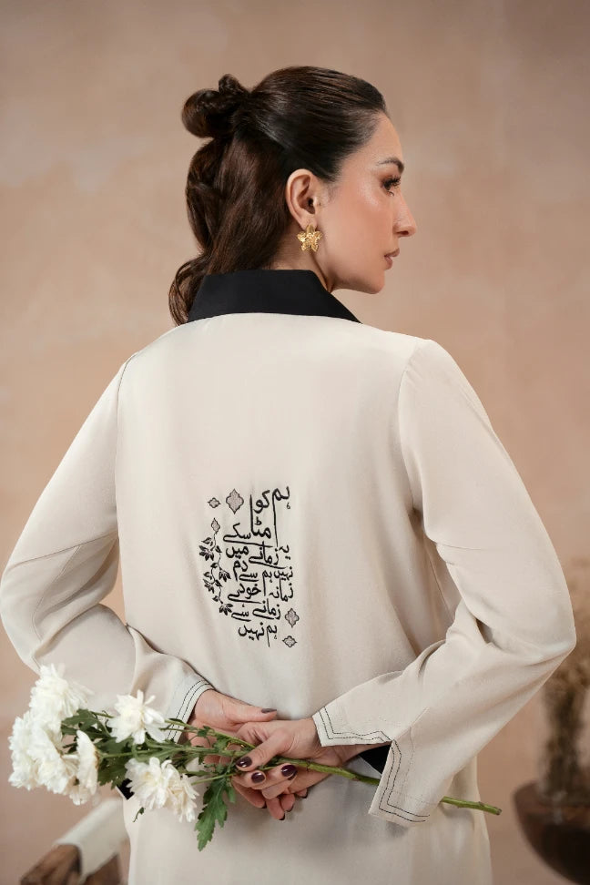 The Nisa Co-Ord, made using Georgette, features a short shirt with an intricate embroidery down the placket and the back. Paired with a culotte pant, this Co-Ord features the words of Jigar Moradabadi.
