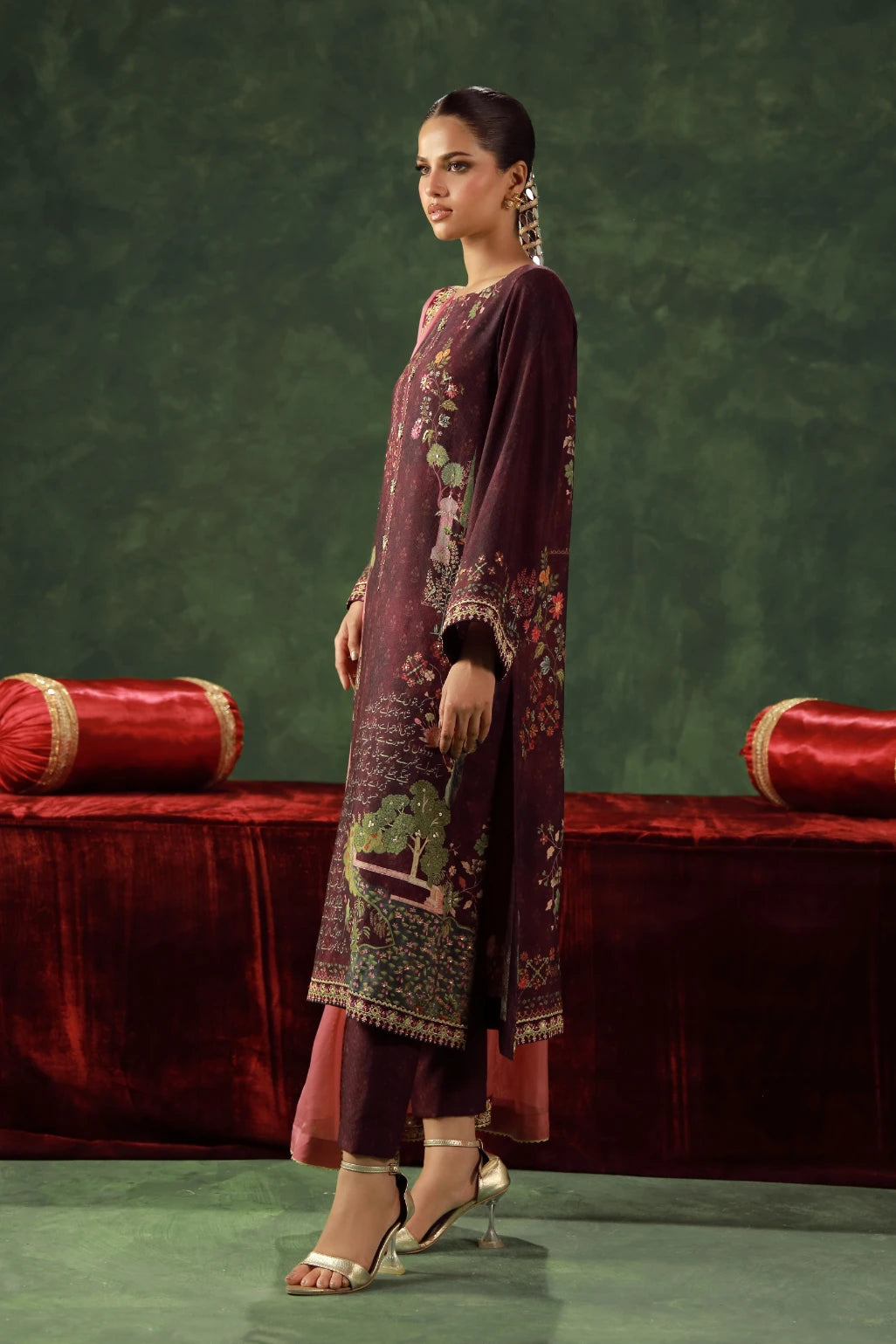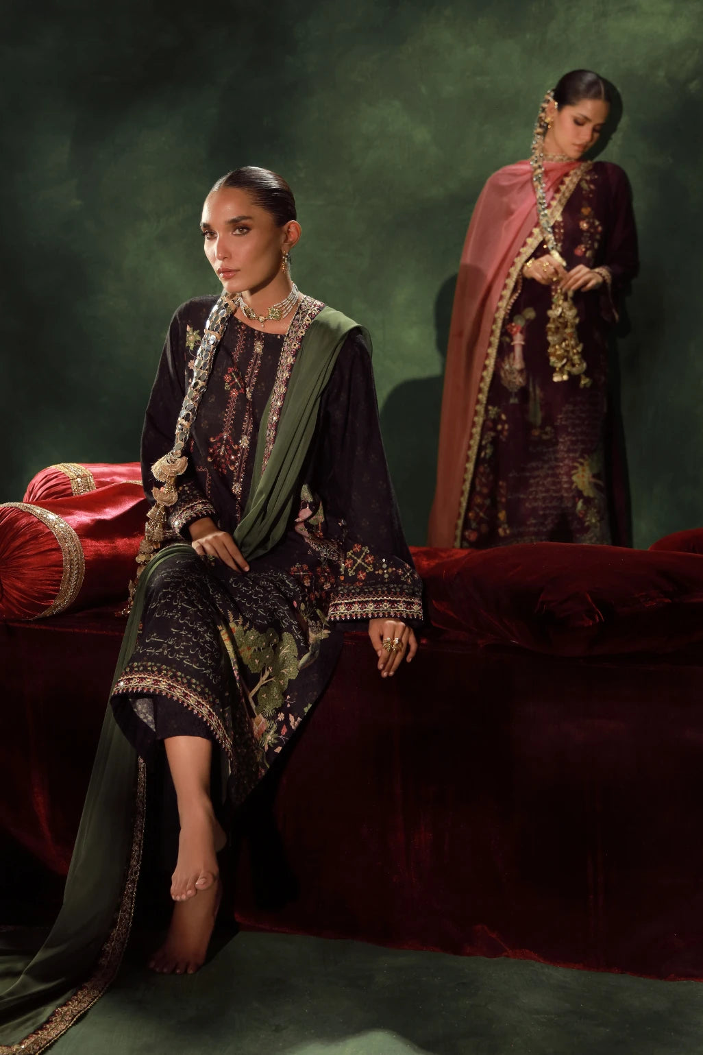 Luxury 3-piece set, made from self cotton. Featuring beautiful embroidery and lace detailing, and Urdu calligraphy of poetry by Sahir Ludhianvi.