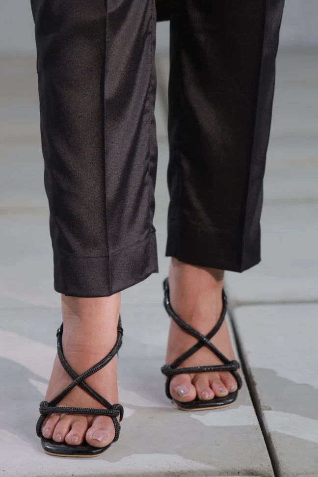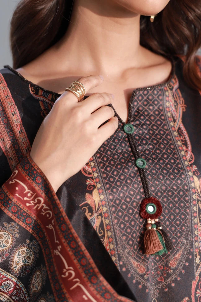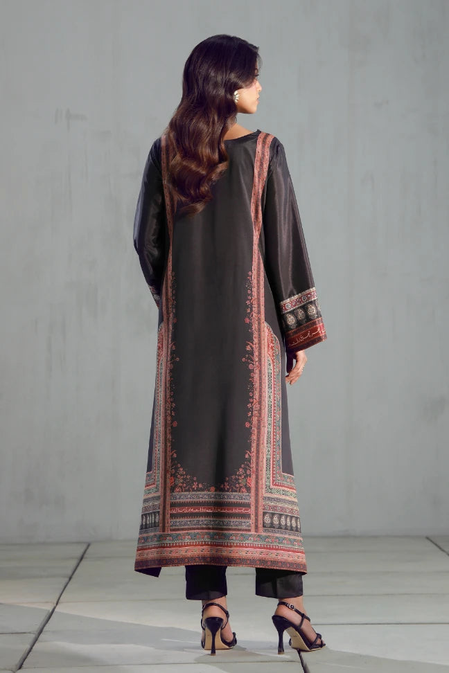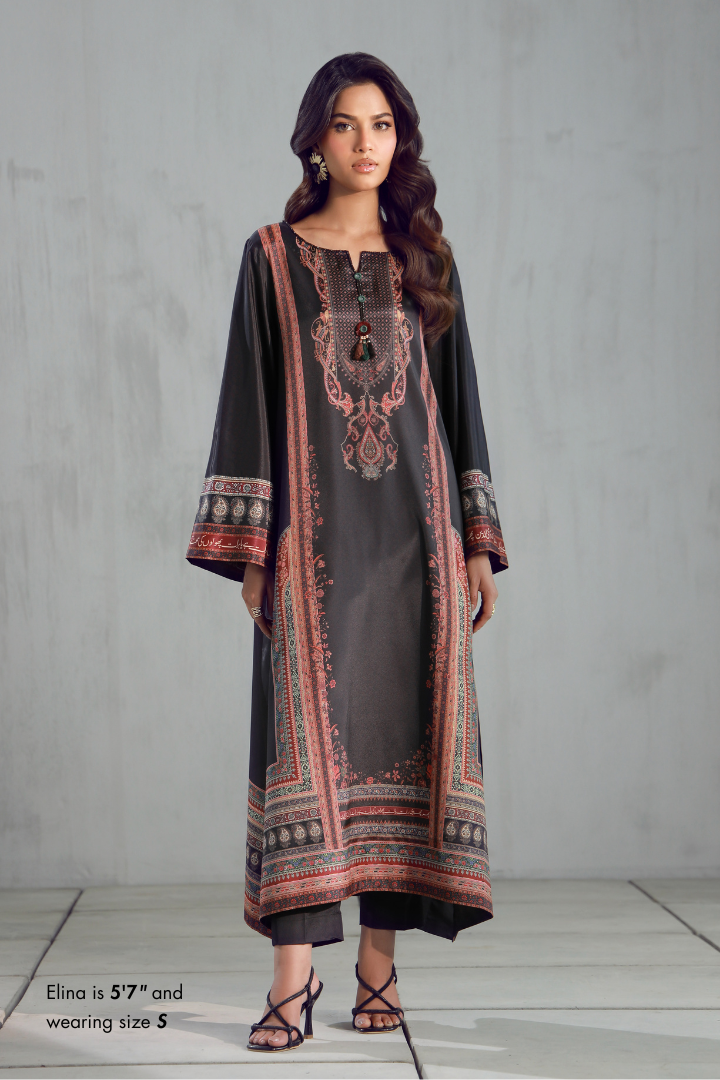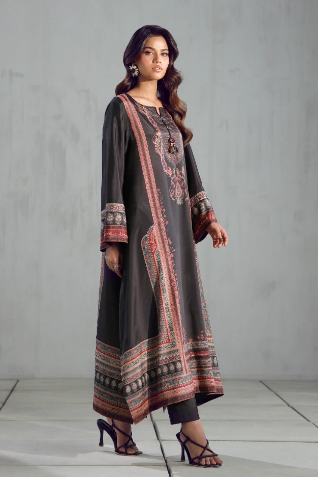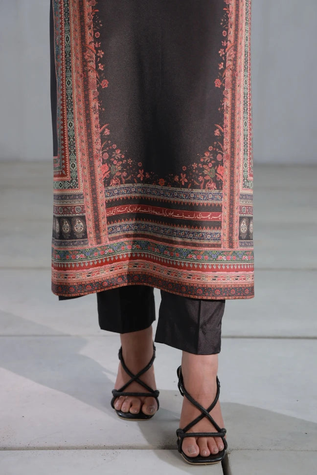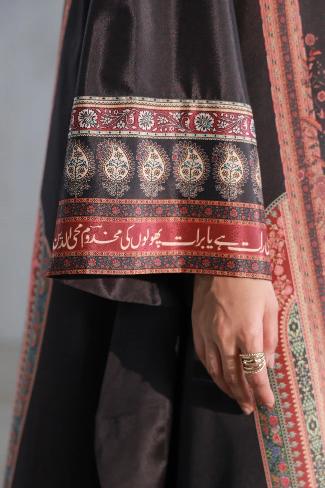 The Koel Co-Ord is a 2-piece crepe set with a long A-line shirt and straight trousers, featuring Makhdoom Mohiuddin’s calligraphy.