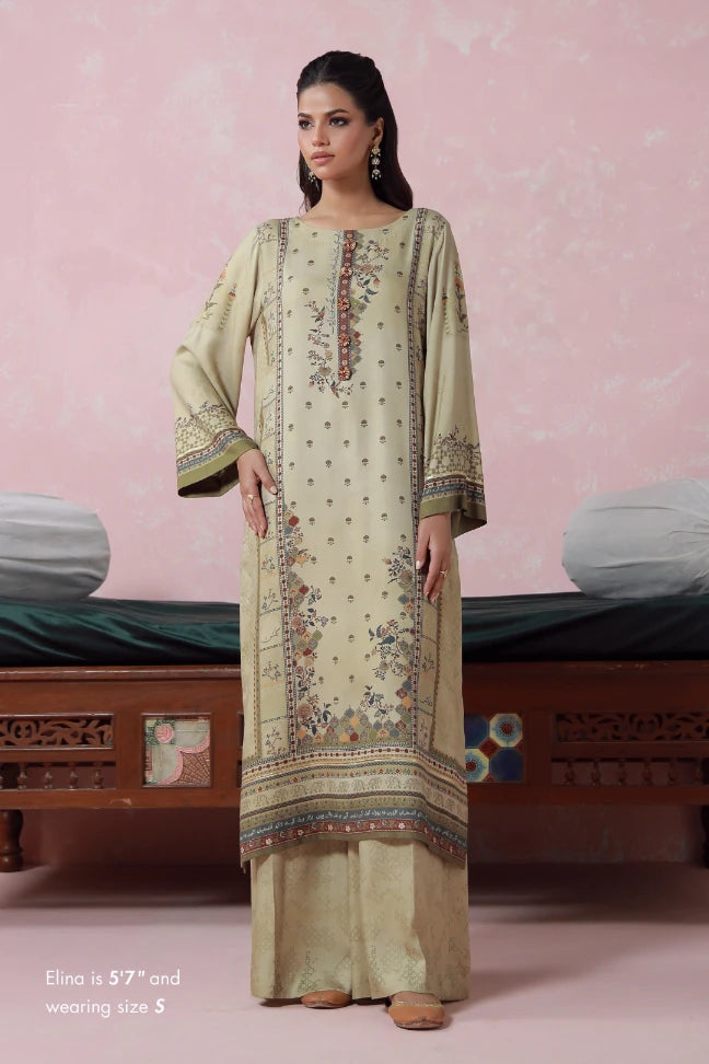 The Musarrat Co-Ord is a 2-piece dobby crepe set with a straight long shirt and plazo pants, featuring Sahir Ludhianvi’s calligraphy.