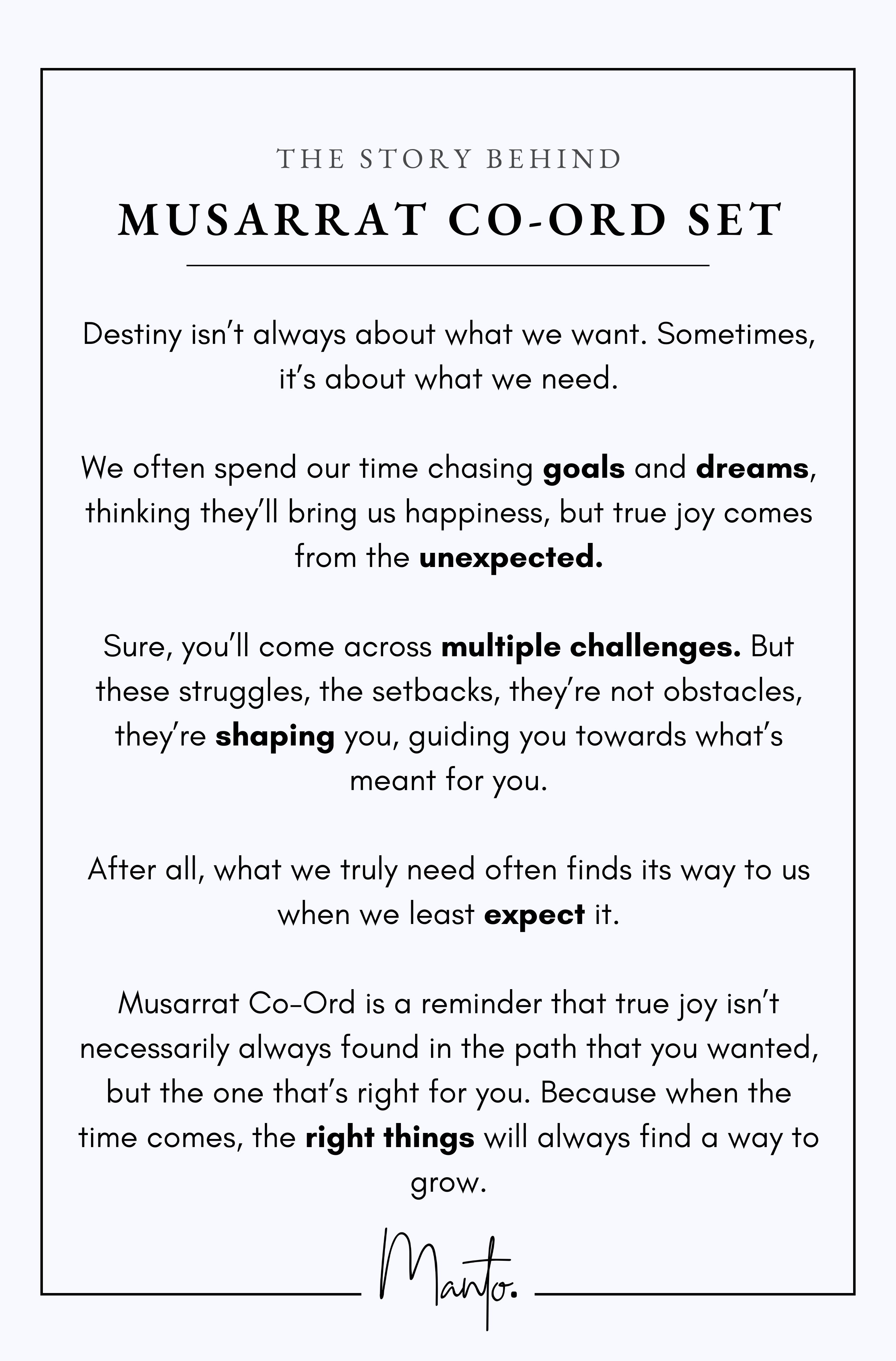 Musarrat Co-Ord is a reminder that true joy isn’t necessarily always found in the path that you wanted, but the one that’s right for you. Because when the time comes, the right things will always find a way to grow.