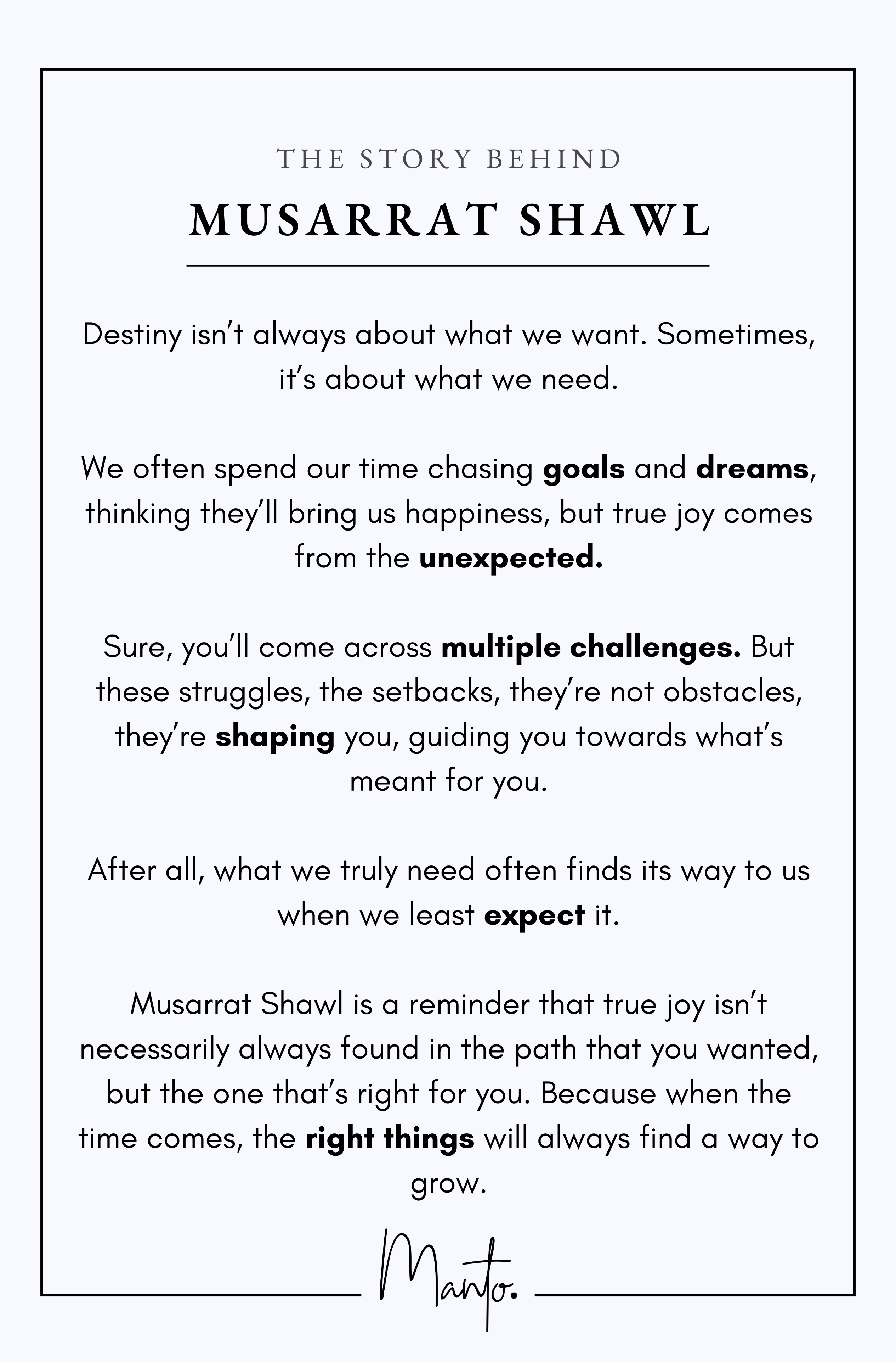Musarrat Shawl is a reminder that true joy isn’t necessarily always found in the path that you wanted, but the one that’s right for you. Because when the time comes, the right things will always find a way to grow.