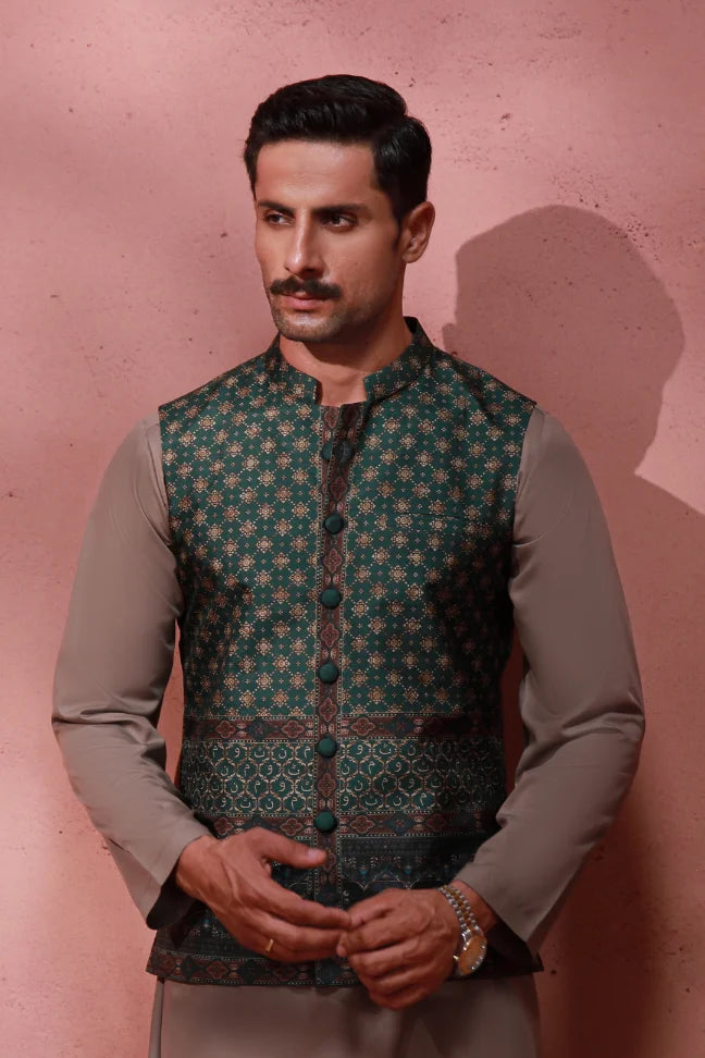 The Alamgir Vasket made from Raw Silk, features Urdu huroofs calligraphed throughout.