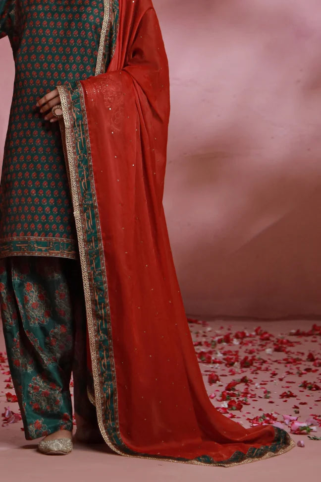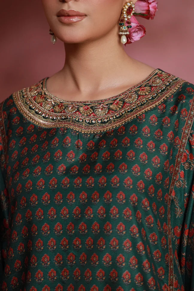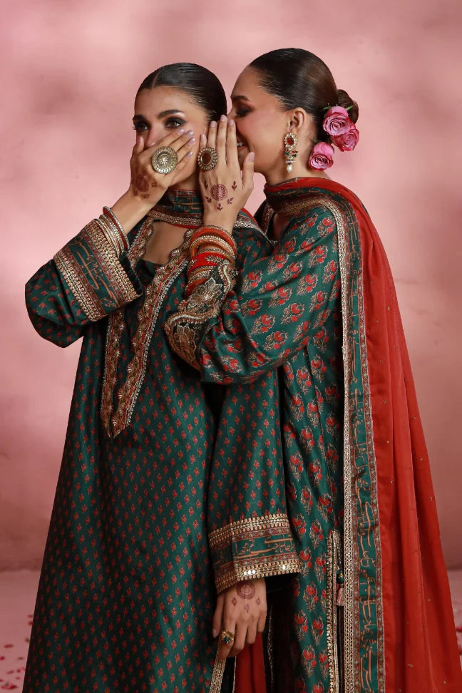 The Jahaan Aara Set in raw silk is a 3-piece ensemble with a short shirt, a farshi shalwar and dyed silk dupatta. It features Sahir Ludhianvi’s poetry calligraphy throughout.