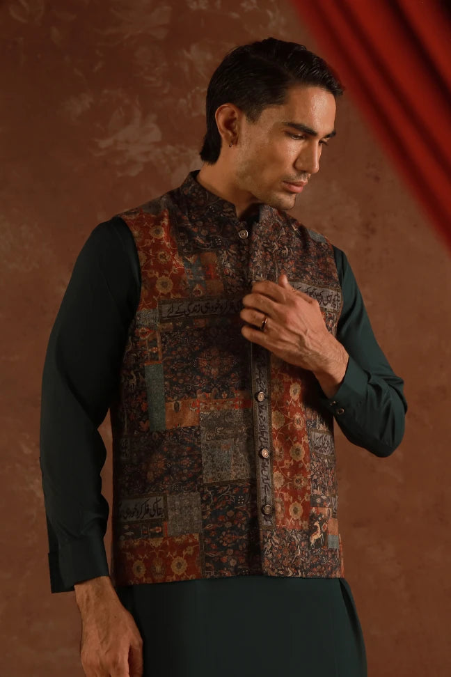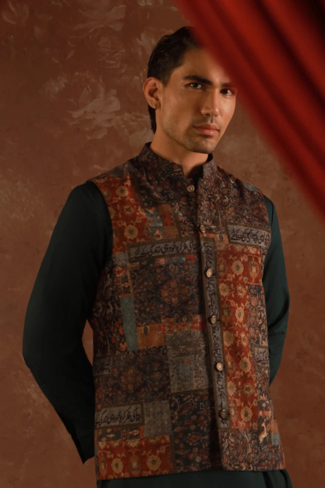 Premium velvet waistcoat featuring Urdu calligraphy of Kaif Moradaabadi across.