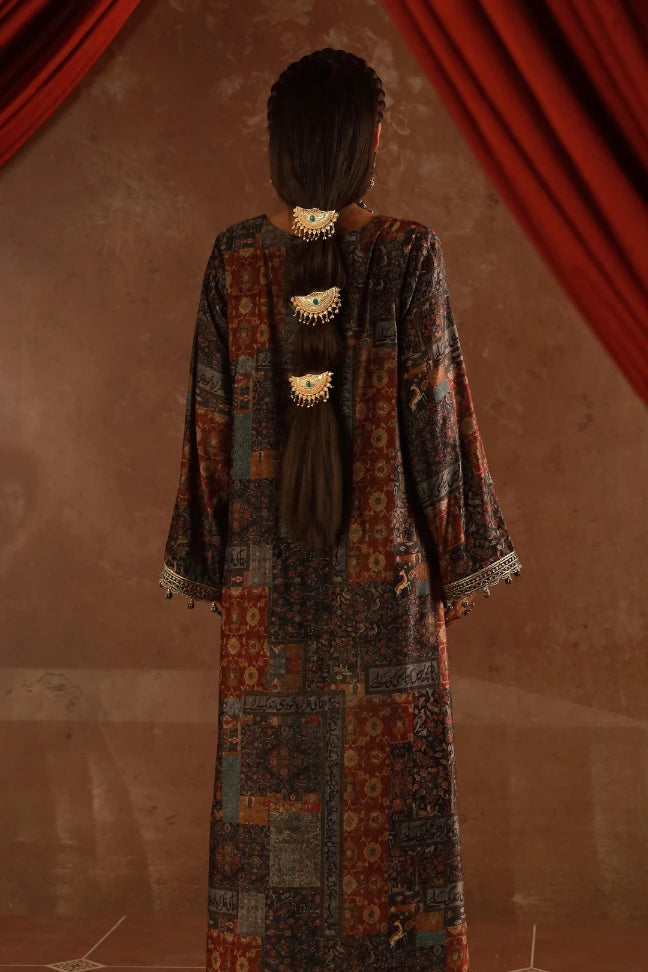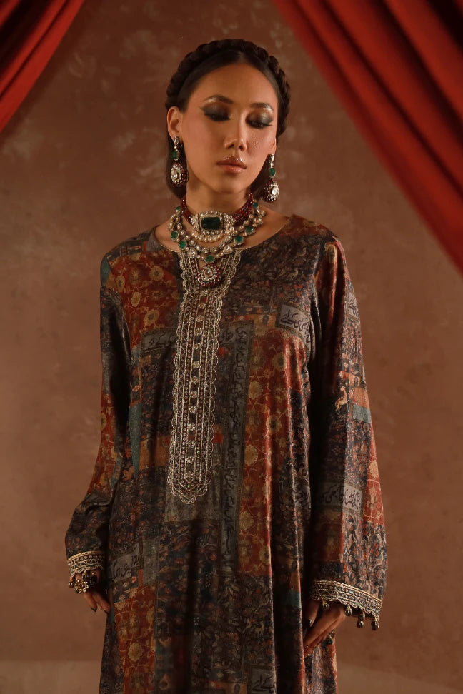 Premium Velvet Kaftaan with embroidered neckline with handmade buttons and dori detailing on the neckline and zari on the sleeves. Featuring the words of Kaif Moradaabadi.