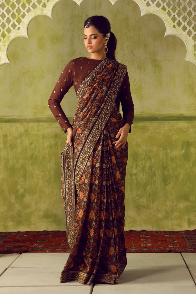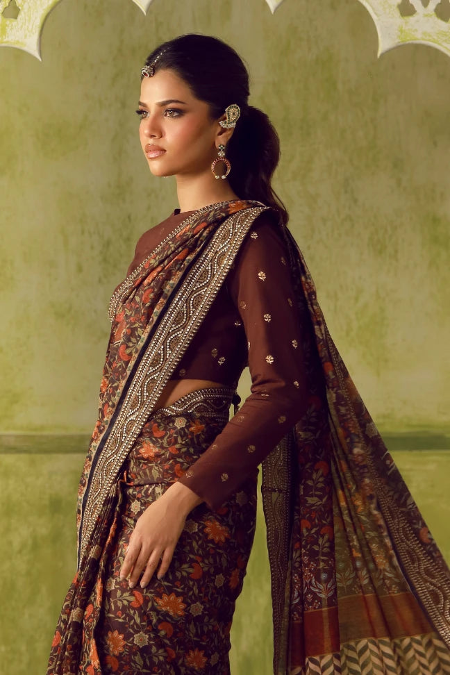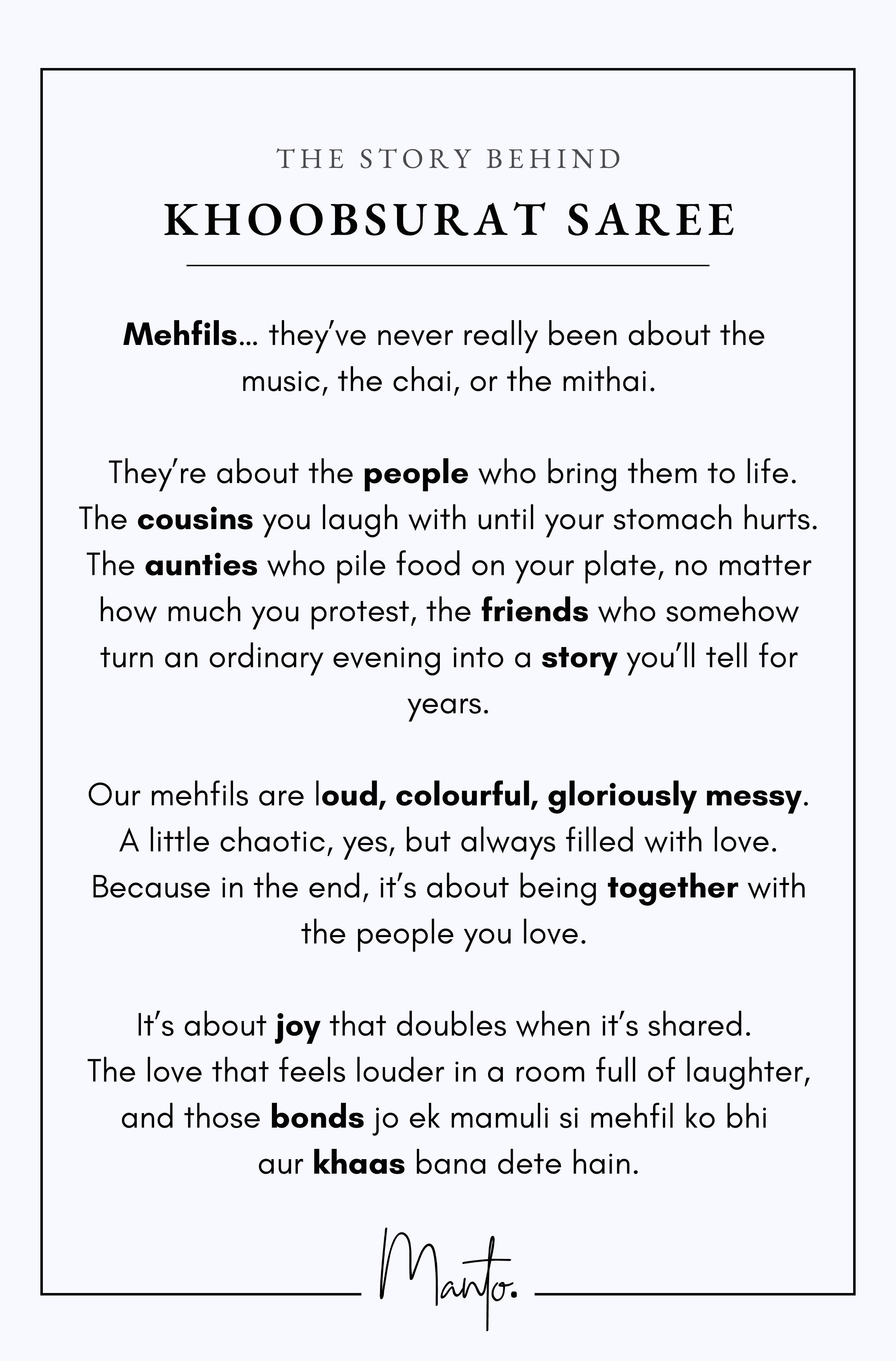 Khoobsurat is a cotton silk ready-to-wear saree with a Banarsi blouse and an embroidered border, featuring Urdu words calligraphed throughout. Available in 2 colors.