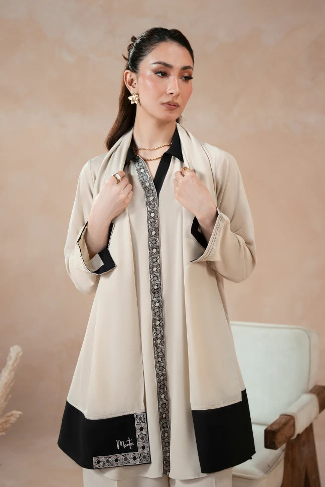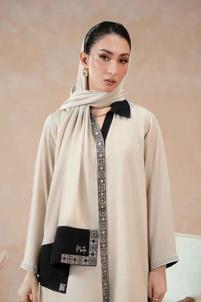 The Aireen Scarf, made using Georgette, features black borders at both ends with embroidered motif on just one side.
