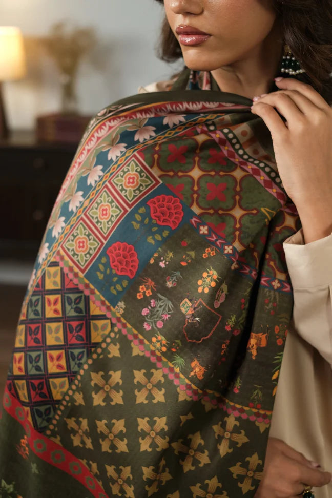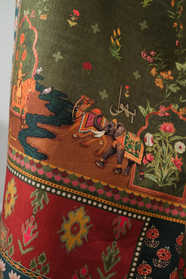 Gulposh Shawl is a double-sided shawl, featuring the words of Makhdoom Mohyuddin calligraphed throughout.