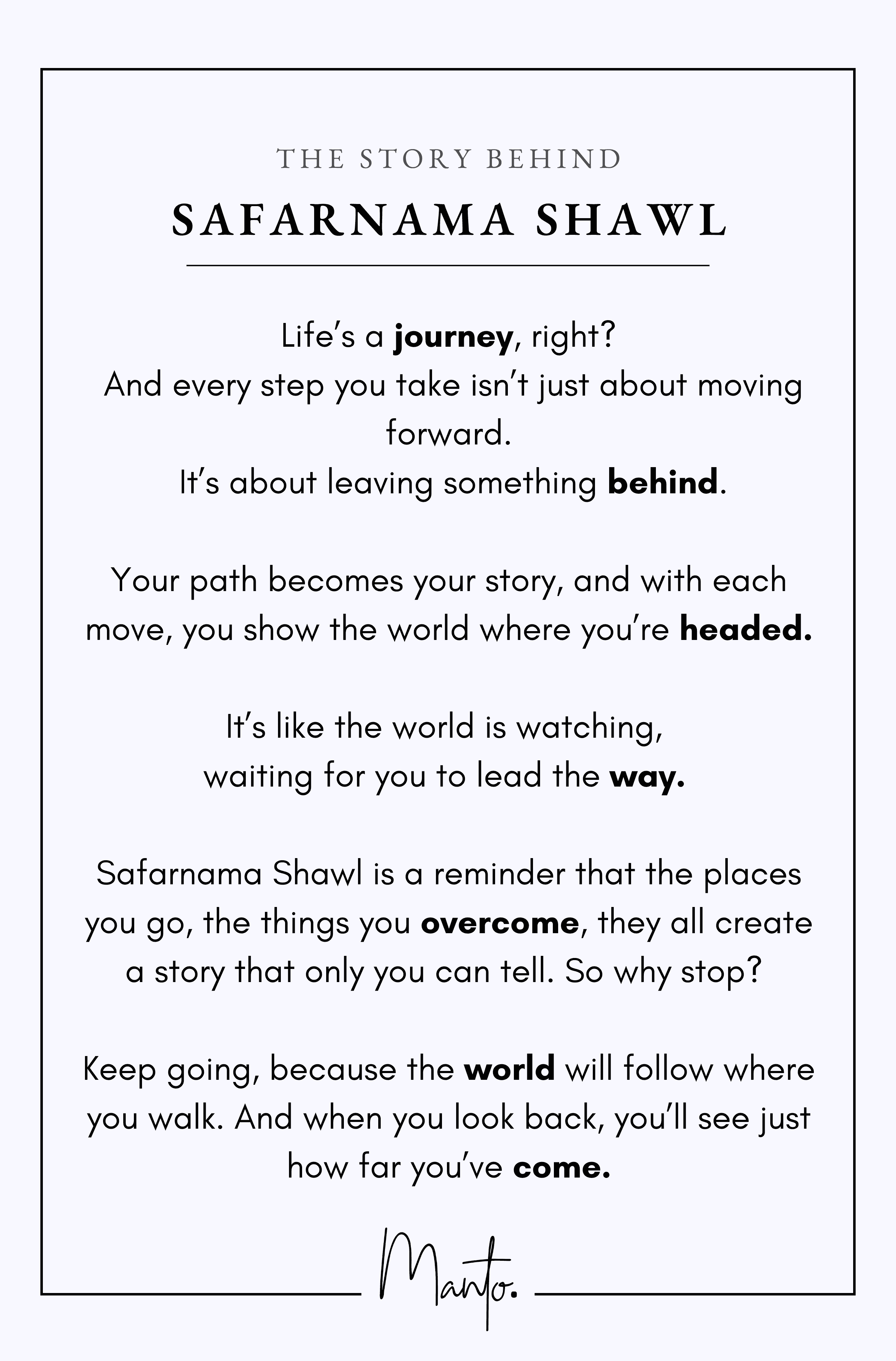 Safarnama Shawl is a reminder that the places you go, the things you overcome, they all create a story that only you can tell. So why stop? Keep going, because the world will follow where you walk. And when you look back, you’ll see just how far you’ve come.