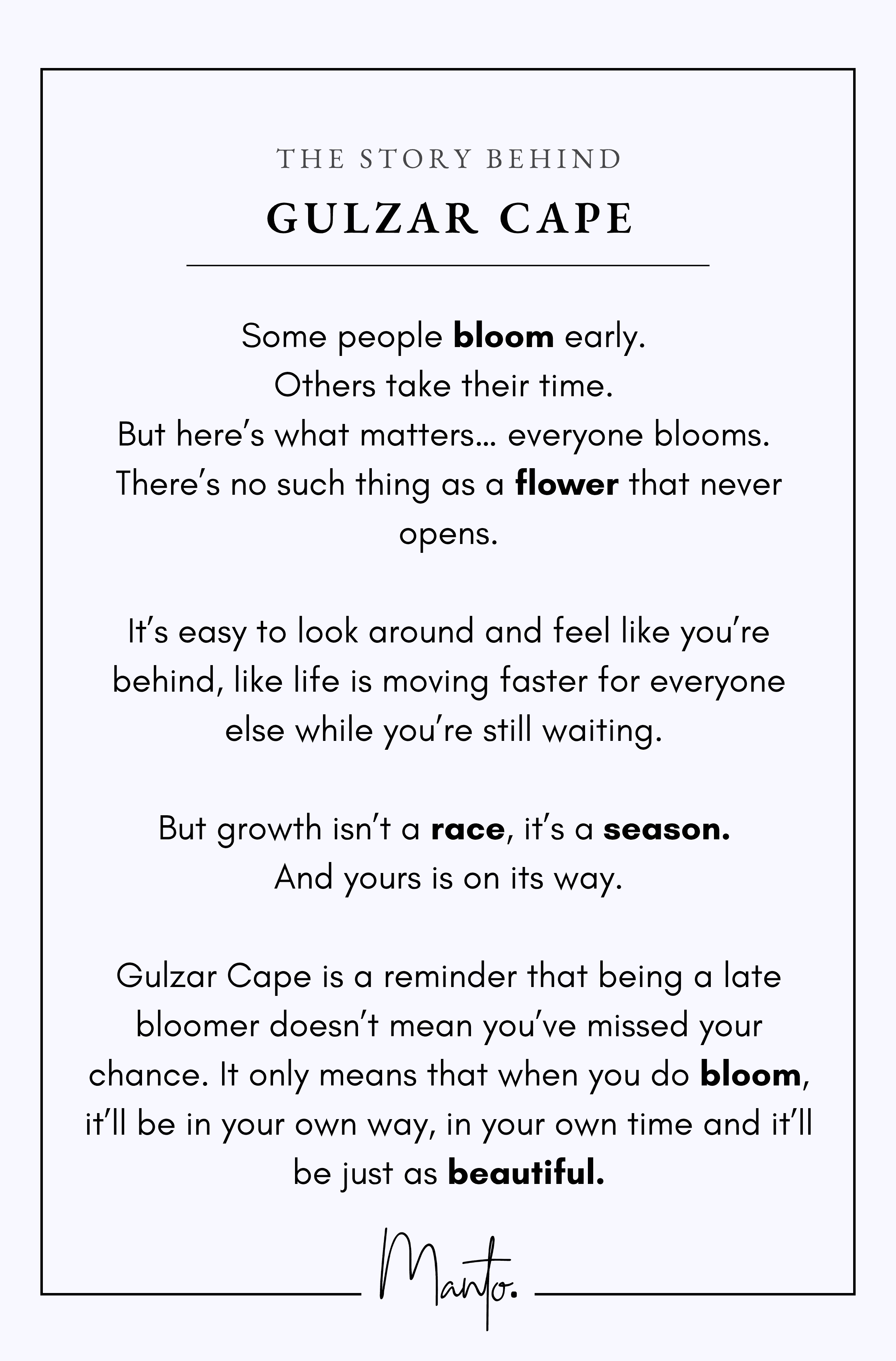 Gulzar Cape is a reminder that being a late bloomer doesn’t mean you’ve missed your chance. It only means that when you do bloom, it’ll be in your own way, in your own time and it’ll be just as beautiful.