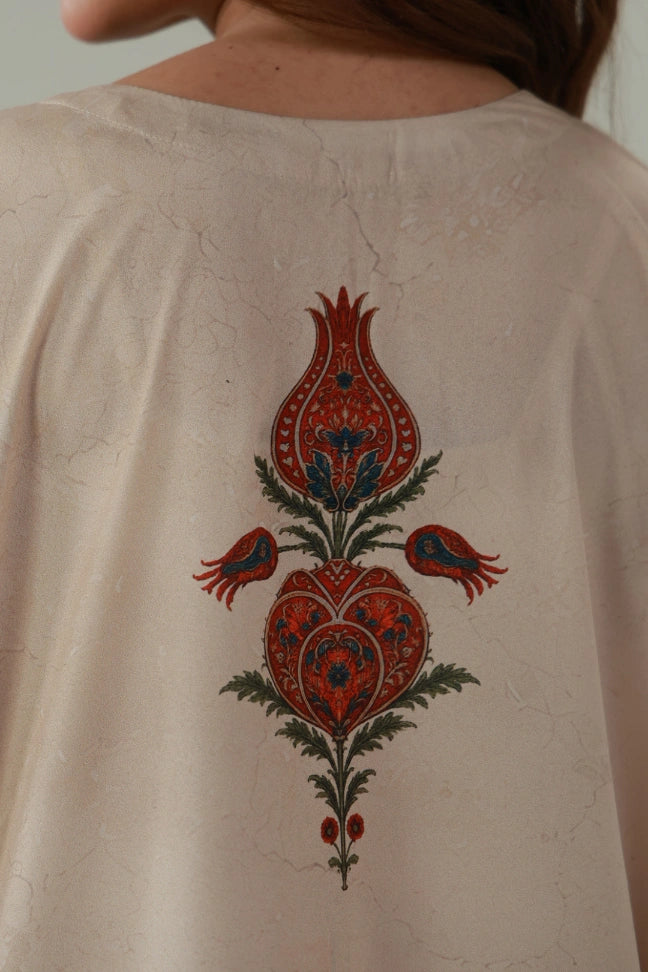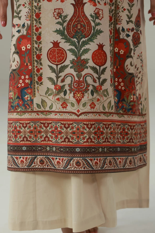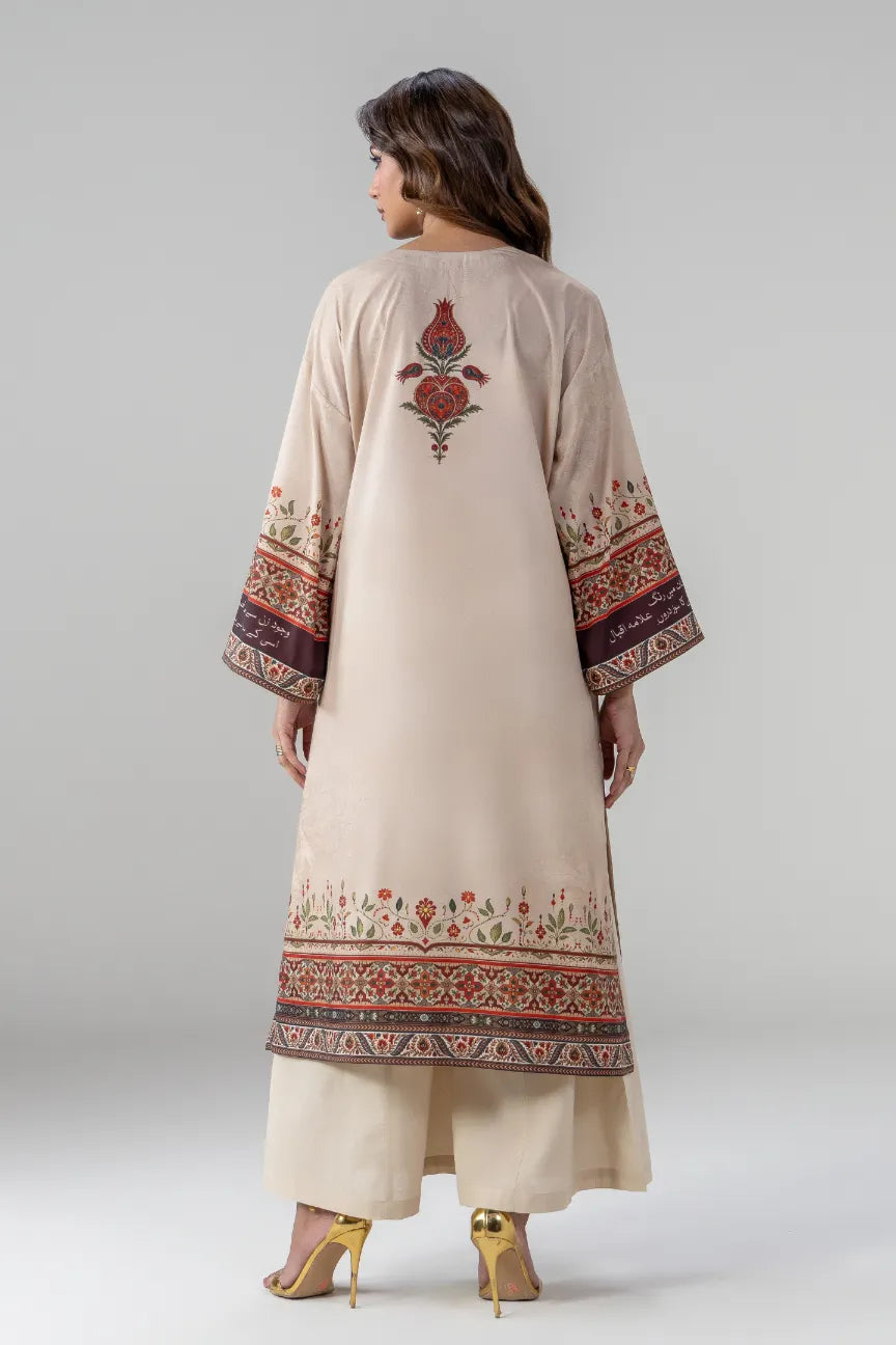 Pariwash Long Shirt is made using crepe, featuring the words of Allama Iqbal calligraphed on the sleeves.
