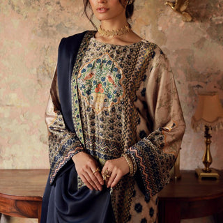 The Shehrzade Set, made from premium Charmeuse Silk, is a 3 Piece Set with a Long-Length Straight Shirt, Straight Pants & Crinkle Silk Dupatta. Featuring the beautiful words of Jaleel Manikpuri, this modern cut features hand-embellishment.